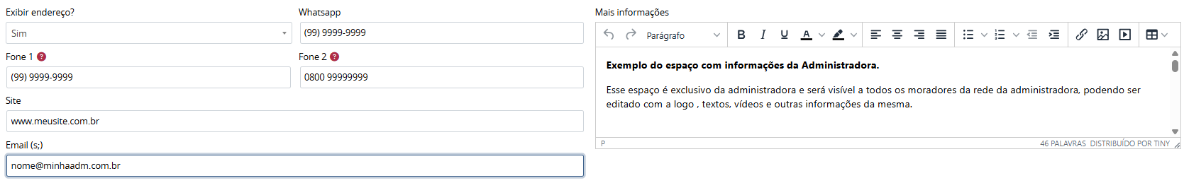 Nesta área, a administradora define os dados que os condôminos visualizarão ao clicar no cabeçalho do app Condomob.