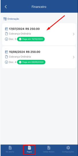 - Na tela Financeiro, toque na aba Pagos no final da tela para ver o seu histórico.