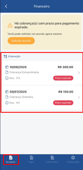 - Você verá a lista de cobranças em aberto com a data de vencimento e o valor.