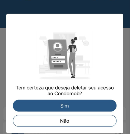 6. Um pop-up aparecerá para confirmar: "Tem certeza que deseja deletar seu acesso ao Condomob?"; para confirmar, clique em Sim;