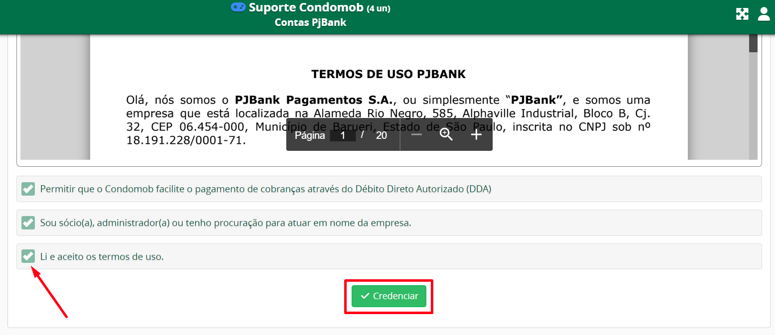 - Leia os termos de uso e marque as caixas de seleção obrigatórias: 'Permitir que o Condomob facilite o pagamento de cobranças através do Débito Direto Autorizado (DDA)'; 'Sou sócio(a), administrador(a), ou tenho procuração para atuar em nome da empresa'; 'Li e aceito os termos de uso';