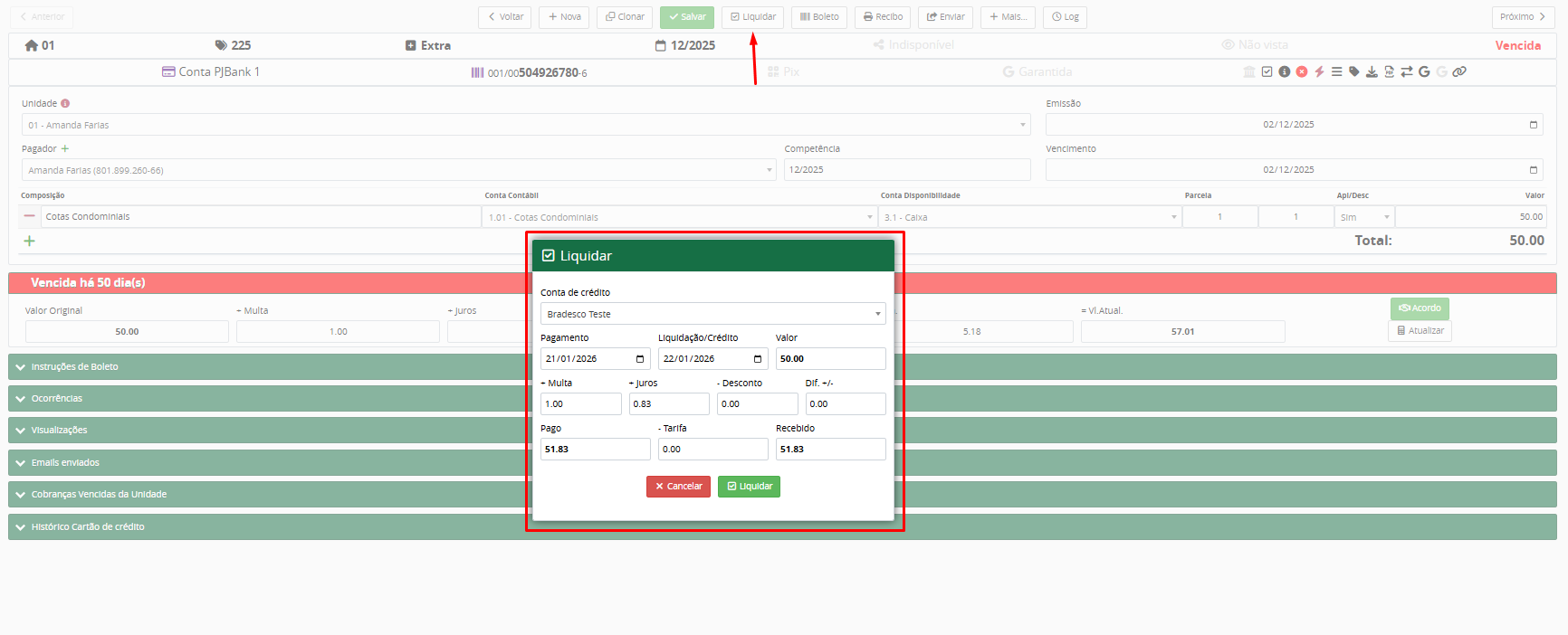 6. Após acessar a cobrança, clique em Liquidar na parte superior da tela;