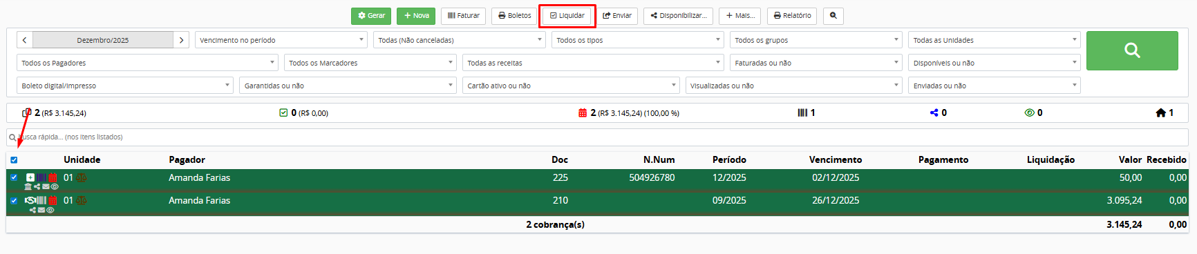 5. Se desejar liquidar apenas uma cobrança, clique na cobrança desejada;