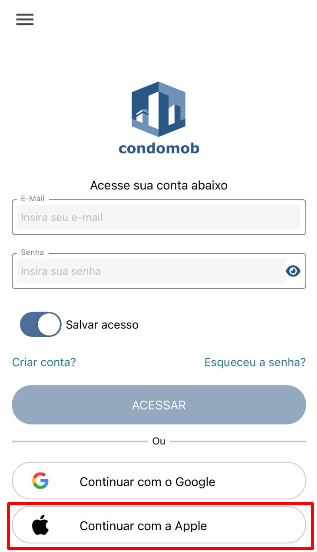 - Abra o aplicativo Condomob e escolha uma das opções de acesso: