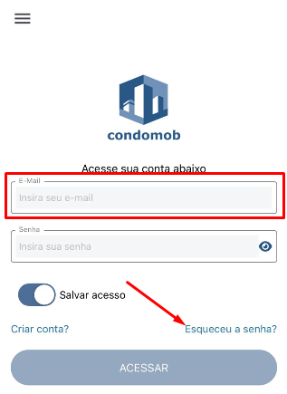 2. Caso já tenha acesso ao app mas esqueceu a senha preencha o campo de email e clique no link Esqueceu a senha?; 1. Um e-mail de redefinição de senha será enviado com o título “Redefinir a senha do app Condomob”; 2. Caso não localize, verifique no lixo eletrônico, spam ou outras caixas de entrada; 3. Abra o e-mail e clique no link para abrir uma nova aba no navegador para inserir a nova senha; 4. Após inserir a nova senha, clique no botão Salvar.