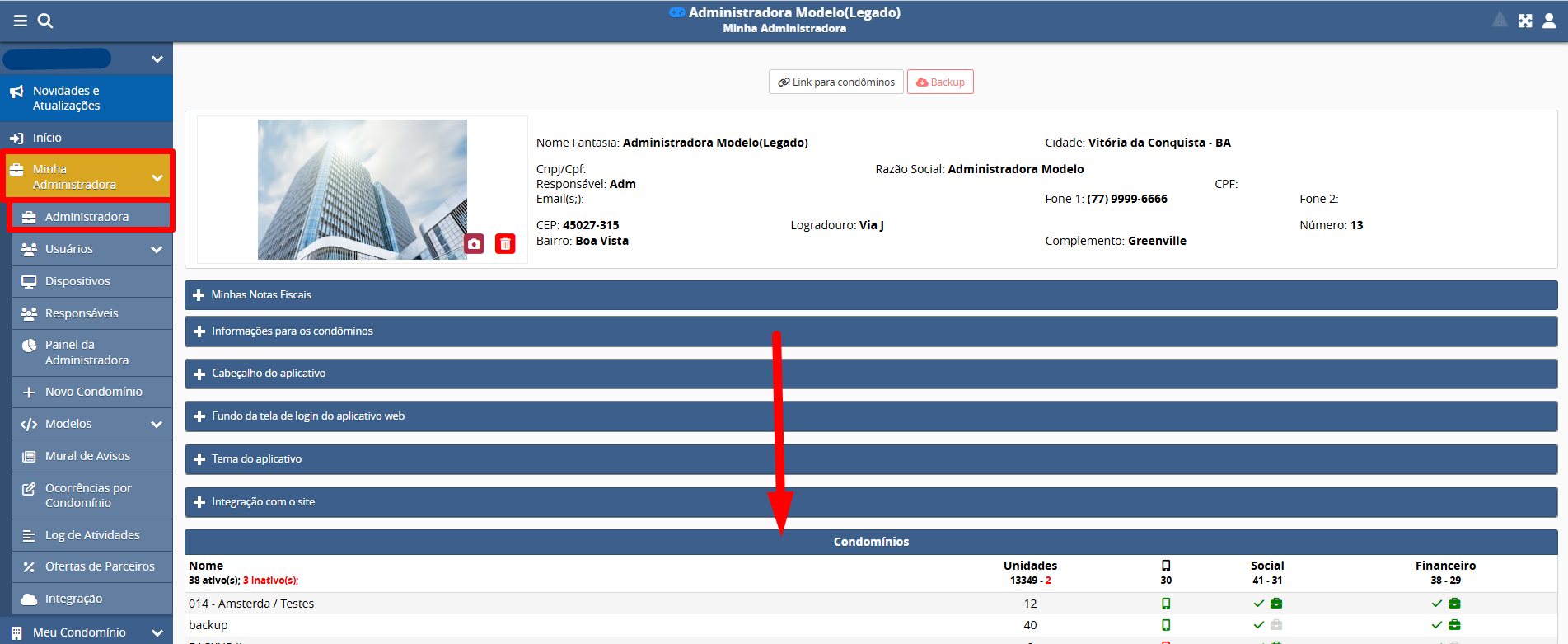Como visualizar lista de condomínios da administradora