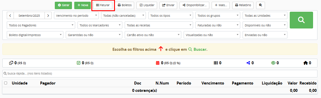 1.5 Selecione as cobranças da listagem e clique em Faturar, na parte superior da tela.
