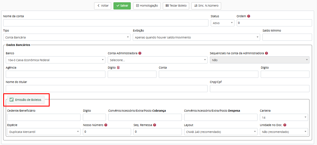 - Caso seja por remessa, certifique-se que a conta bancária estejacadastrada e homologada para emissão de boletos (em Contas Financeiras).