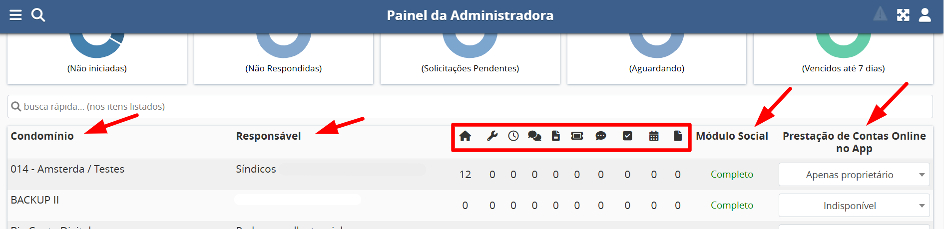 Abaixo do painel de demandas, é exibida uma listagem com todos os condomínios da base, contendo informações como: