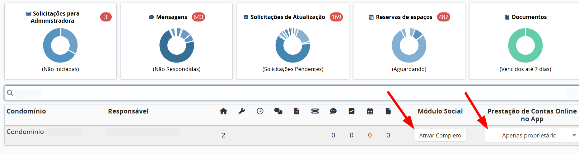 - Nome, responsável, número de unidades, quantidade de manutenções, assembleias (criadas e sem atas), mensagens, solicitações de atualização, reservas de espaço e documentos registrados.