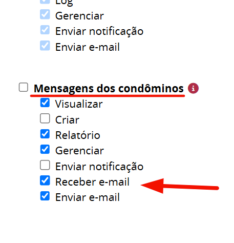 Se você quiser que um perfil de Síndico receba apenas e-mails sobre encomendas e livro de ocorrências, basta manter marcada a opção de recebimento nessas funções e desmarcar as demais.