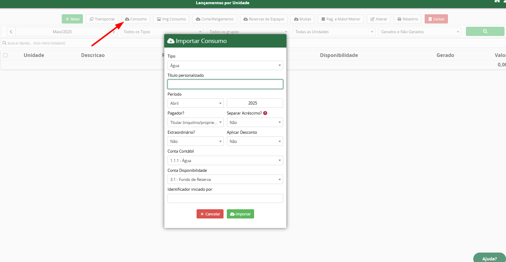 - Clique no botão Consumo para iniciar a importação dos valores das leituras do aplicativo.