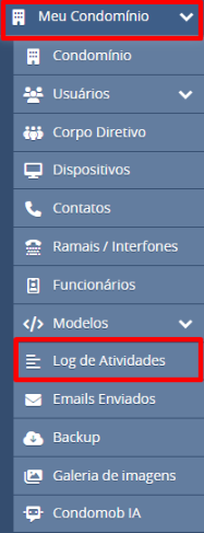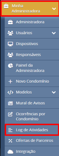 - No menu à esquerda, clique em Minha Administradora ou Meu Condomínio e selecione a opção Log de Atividades.