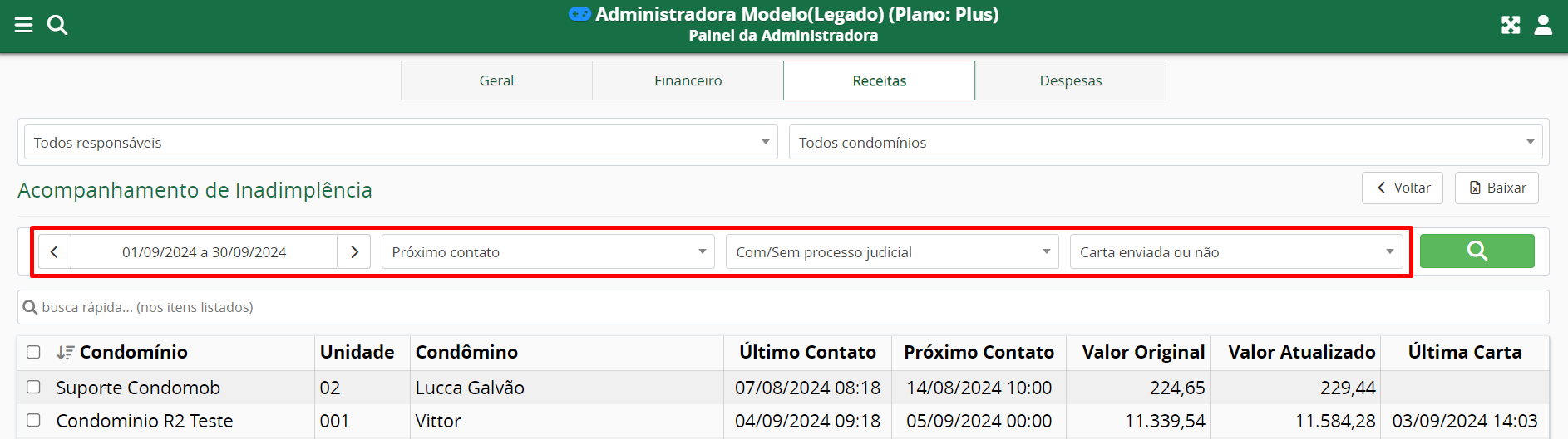 Ao clicar na sessão, será possível filtrar por período, por Último Contato ou Próximo Contato, por Unidade com ou sem processo judicial e por Carta de cobrança enviada ou não. Com isso, o sistema mostrará o condomínio, a unidade, o nome do condomínio, o último contato realizado e qual a data do próximo contato a ser feito. Mostrará também o valor total original das cobranças vencidas, o valor total atualizado da inadimplência e a data da última carta de cobrança enviada.
