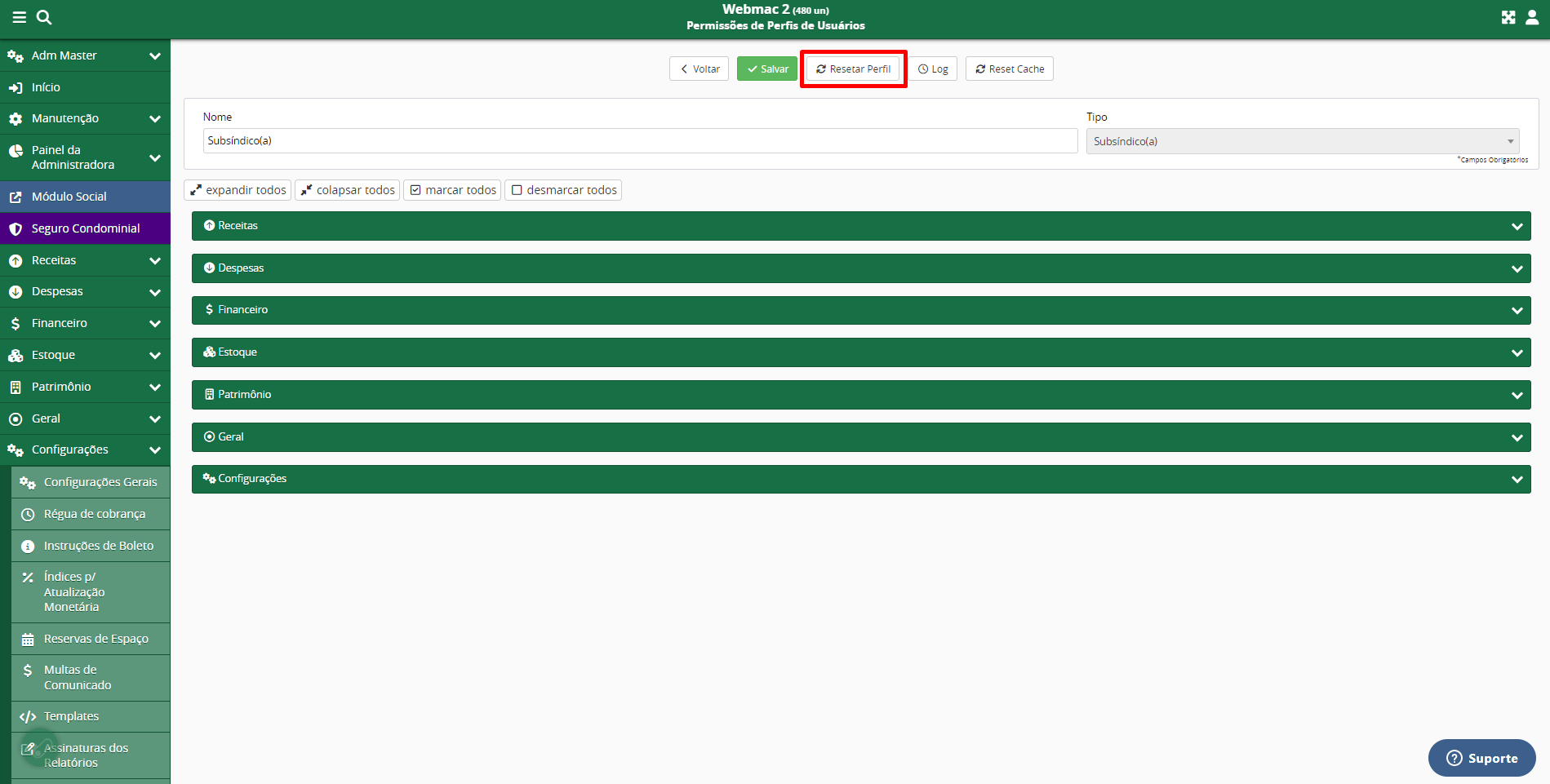 Se um usuário estiver tendo problemas de acesso, por exemplo, não estiver conseguindo executar uma ação que acabou de ser acrescentada ao ser perfil, utilize o botão "Reset cache" para fazer a limpeza e solicite que o usuário atualize a página para verificar se era apenas uma questão de memória cache.