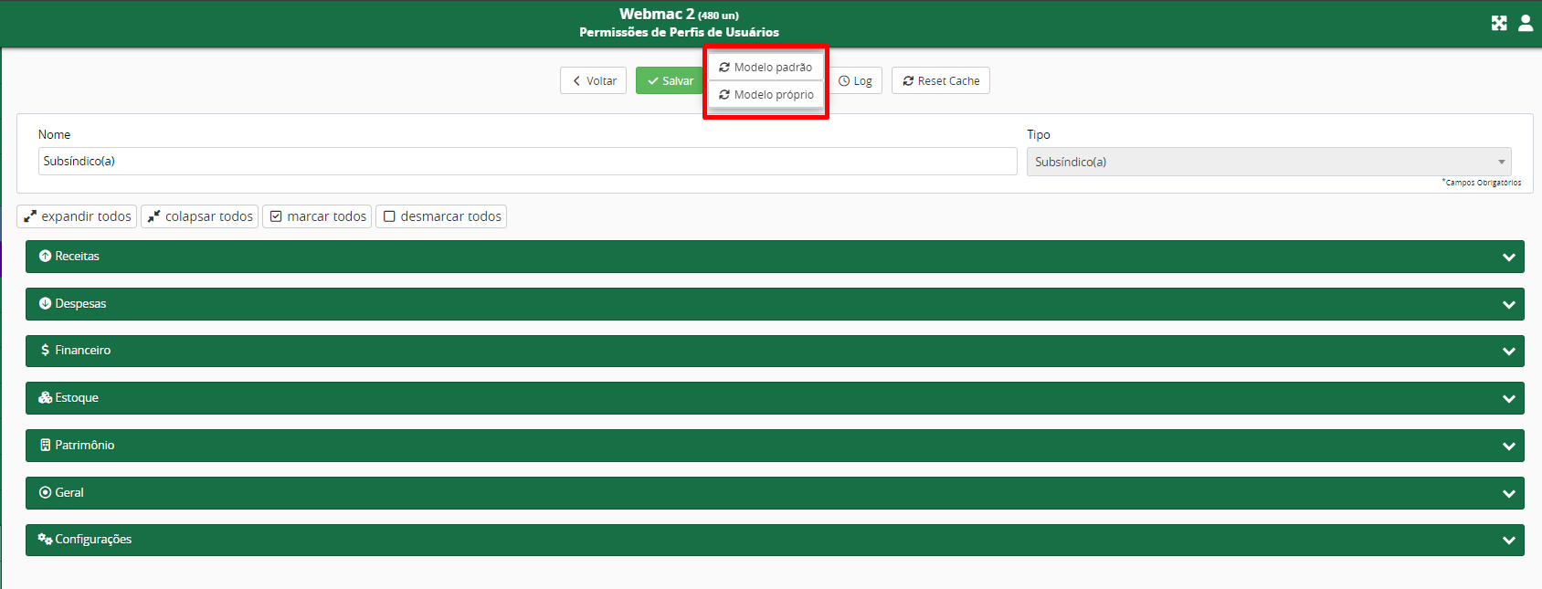 Caso tenha criado um novo perfil, seja a partir de um modelo padrão ou por um modelo próprio, e queira que as configurações voltem a serem iguais ao tipo padrão ou modelo próprio, clique no perfil que irá resetar, depois clique no botão "Resetar perfil":