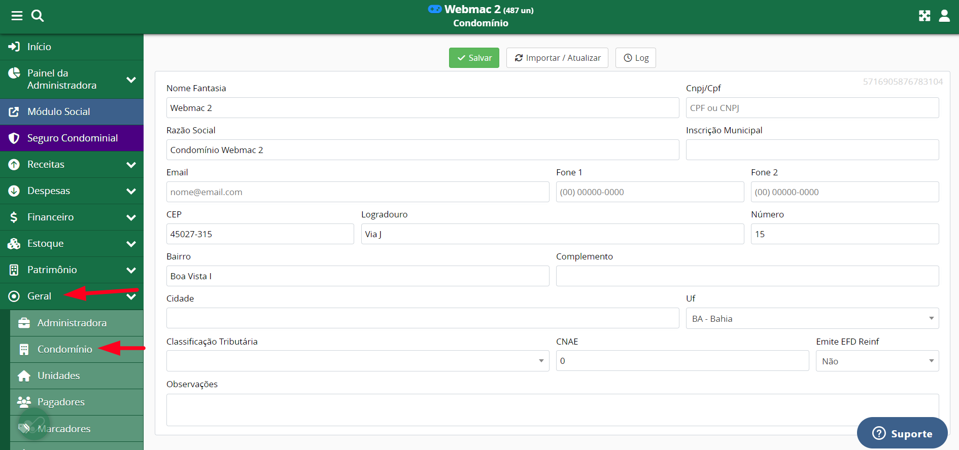 Sempre que alguma alteração for efetuada, clique em Importar/Atualizar para os dados do Condomob