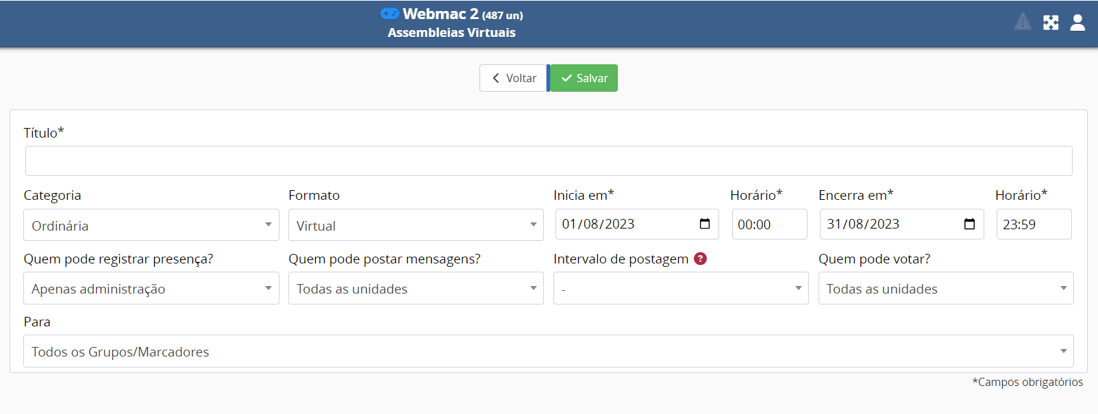 - Para: Selecione os grupos/marcadores de unidades que terão acesso à assembleia ou selecione a opção "Todos os grupos/Marcadores".