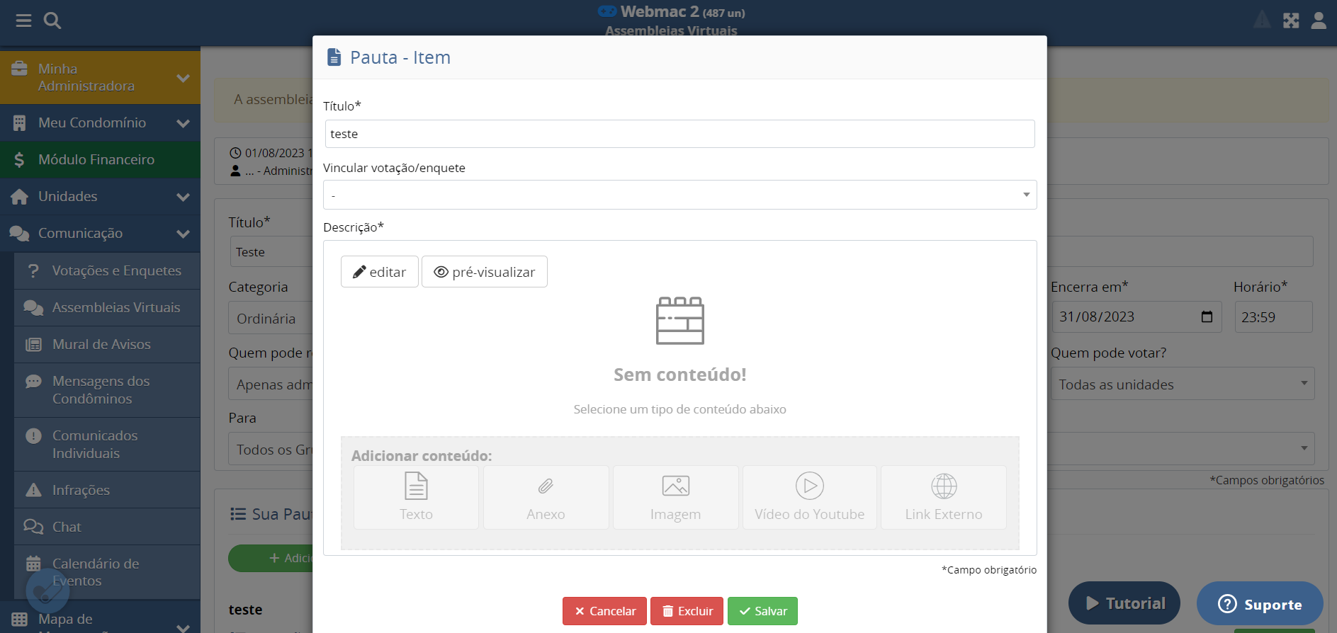 Observação: Existe o limite de 15 pautas por assembleia criada no sistema.