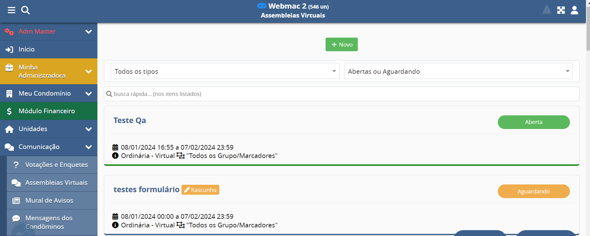Na tela inicial da função Assembleias Virtuais, clique no botão "+ Novo" para criar uma assembleia: