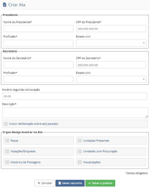 Após o encerramento da assembleia poderá criar a ata selecionando as informações que irão compor o documento.
