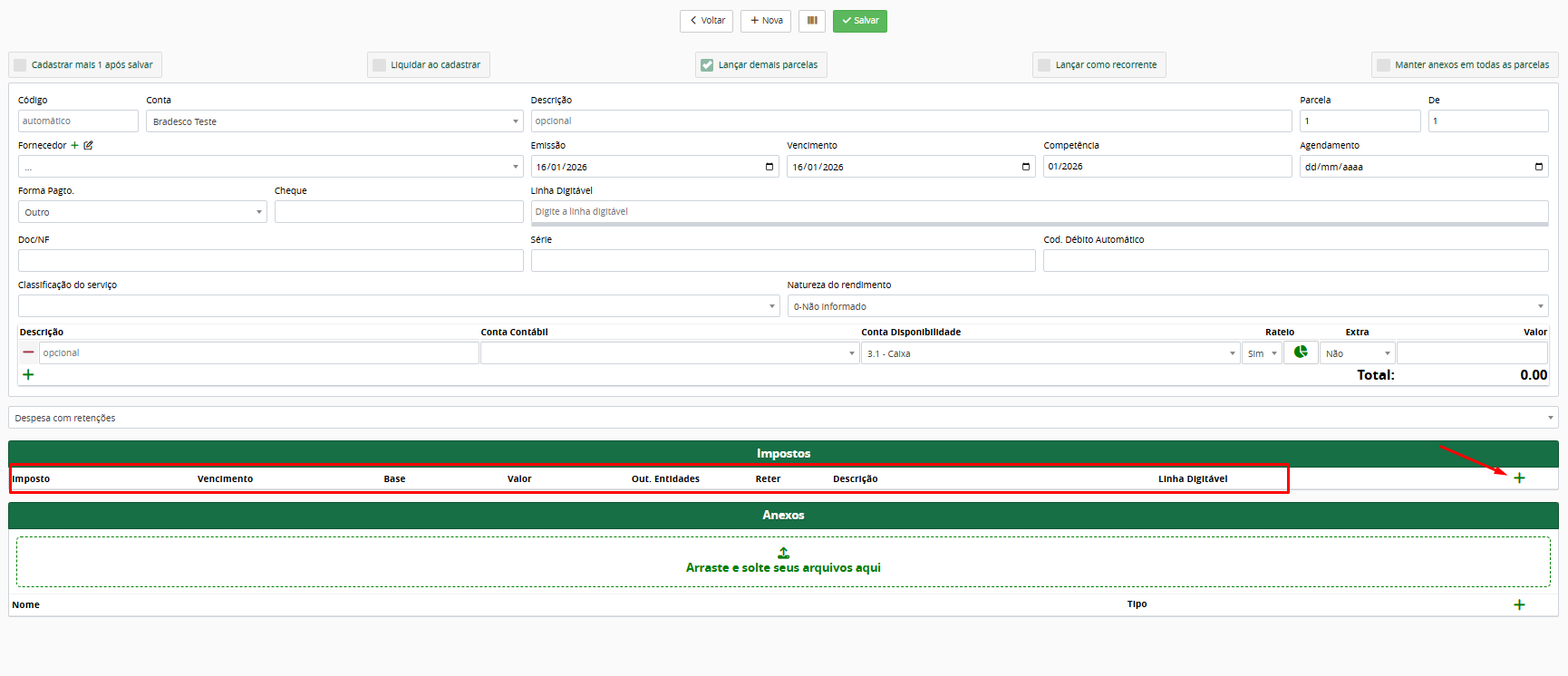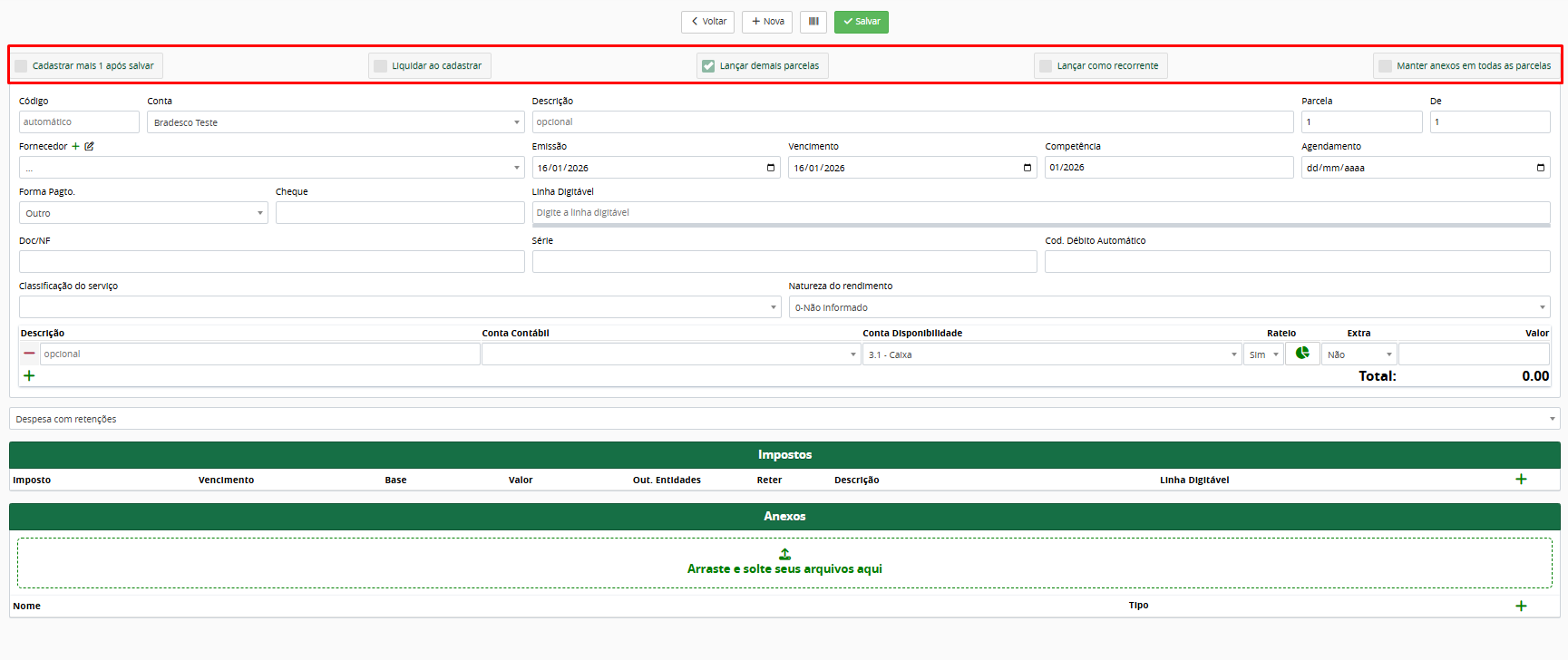 - Cadastrar mais 1 após salvar: Para lançamentos sequenciais.