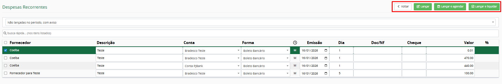 Clique no botão de recorrência na tela inicial. O sistema mostrará o que não foi lançado no período. Selecione os itens e escolha entre: Lançar, Lançar e Agendar ou Lançar e Liquidar.