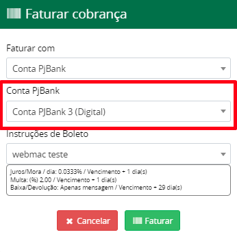- Selecione a opção "Faturar com conta PJBank";