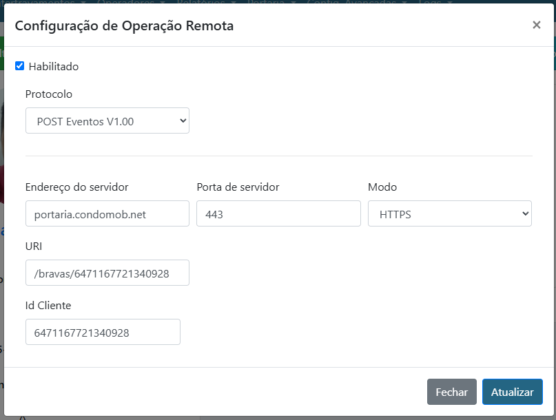 Modo: HTTPS - Em URL os dados serão: /bravas/IDdoCondominio