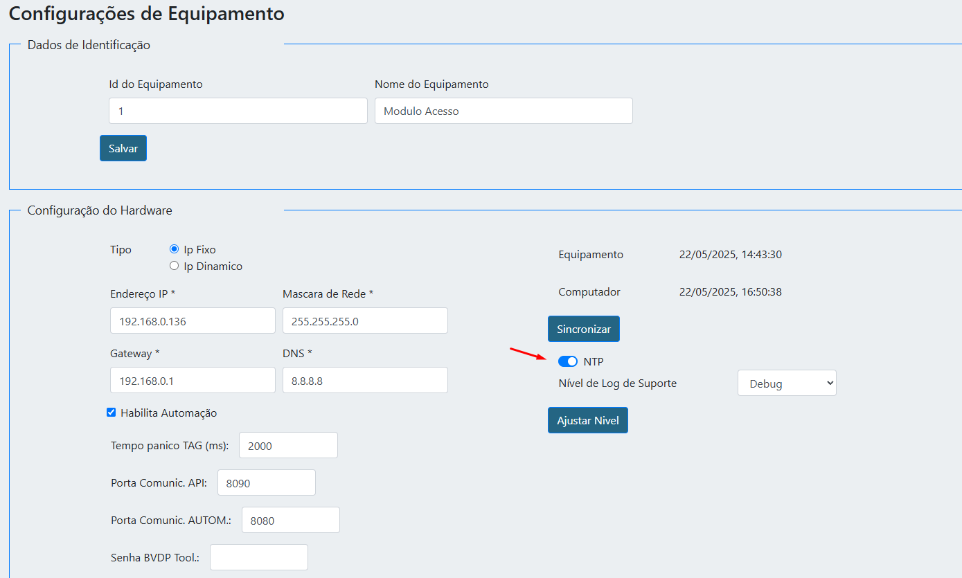 É necessário realizar a configuração de IP da controladora e porta (interna) de comunicação de API, que será utilizada para se integrar ao Condomob. É importante também deixar o NTP ligado para sincronização dos horários dos eventos.
