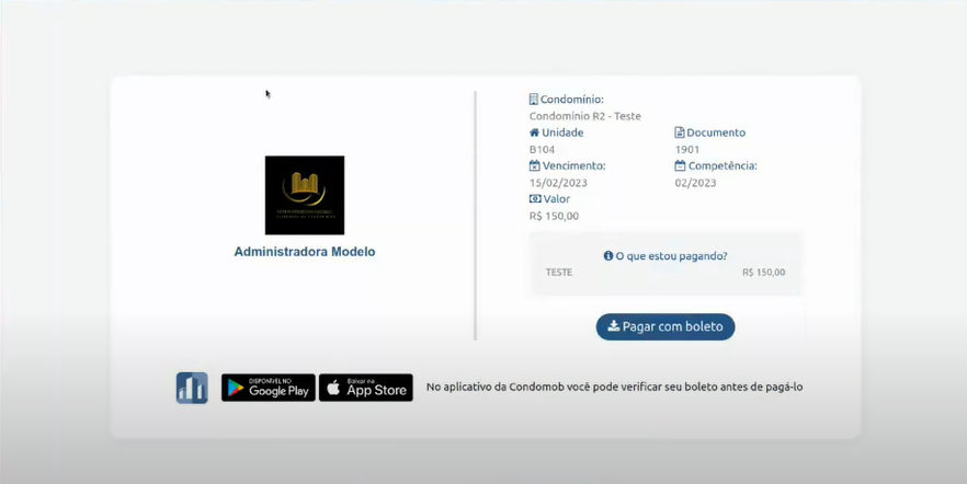 Em tela o condômino irá visualizar as seguintes informações e após conferência deverá clicar no botão "Pagar com boleto":