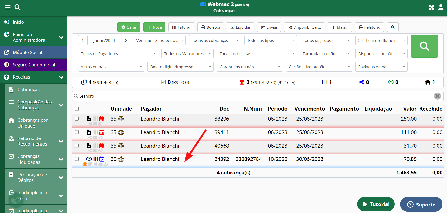 Realize a busca e clique em cima da própria cobrança faturada para a qual deseja enviar o boleto para um ou mais endereços de e-mail personalizados, isto é, para e-mails que já não estejam no cadastro do condômino: