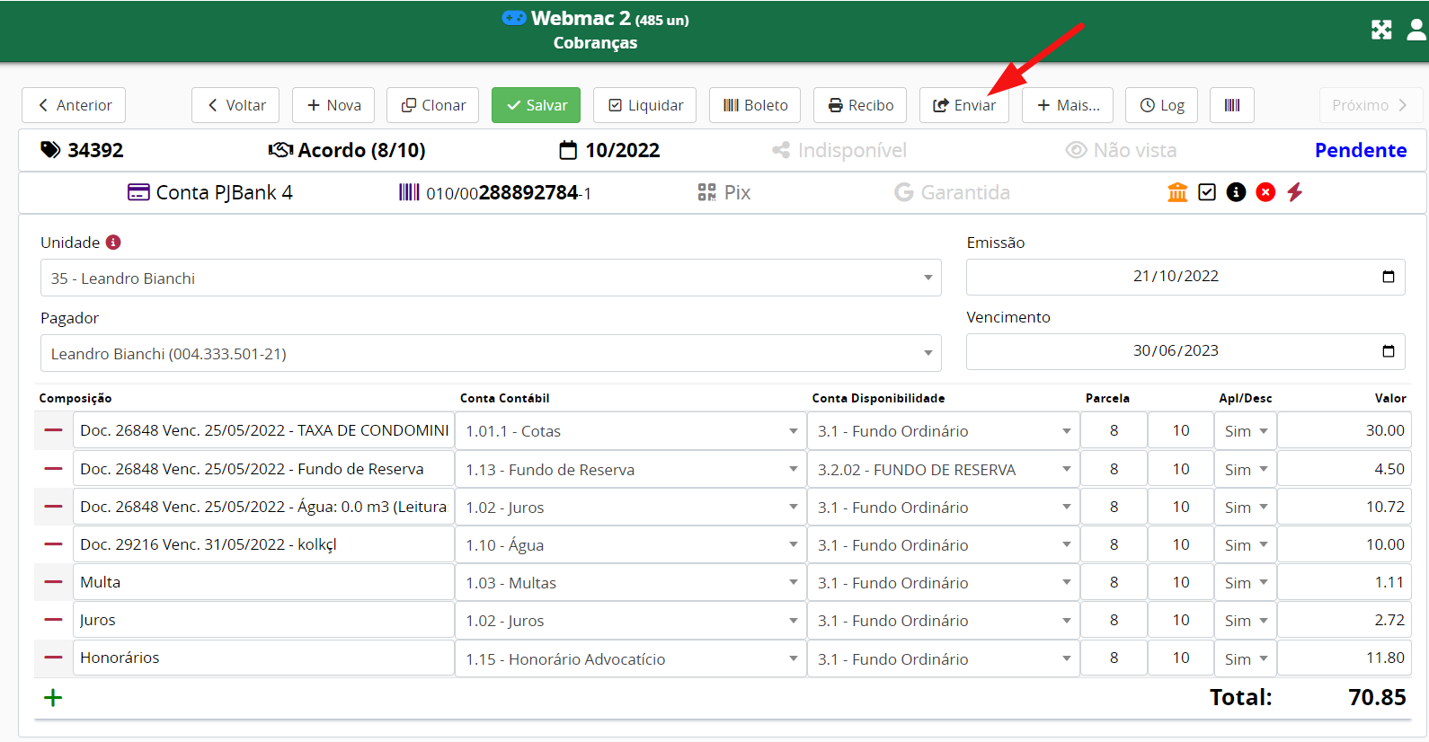 O Administrador poderá enviar o boleto da cobrança por e-mail de forma personalizada para mais de um endereço de e-mail