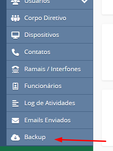 Para baixar um arquivo de backup no módulo Financeiro, clique em "Configurações", e depois em "Backup":