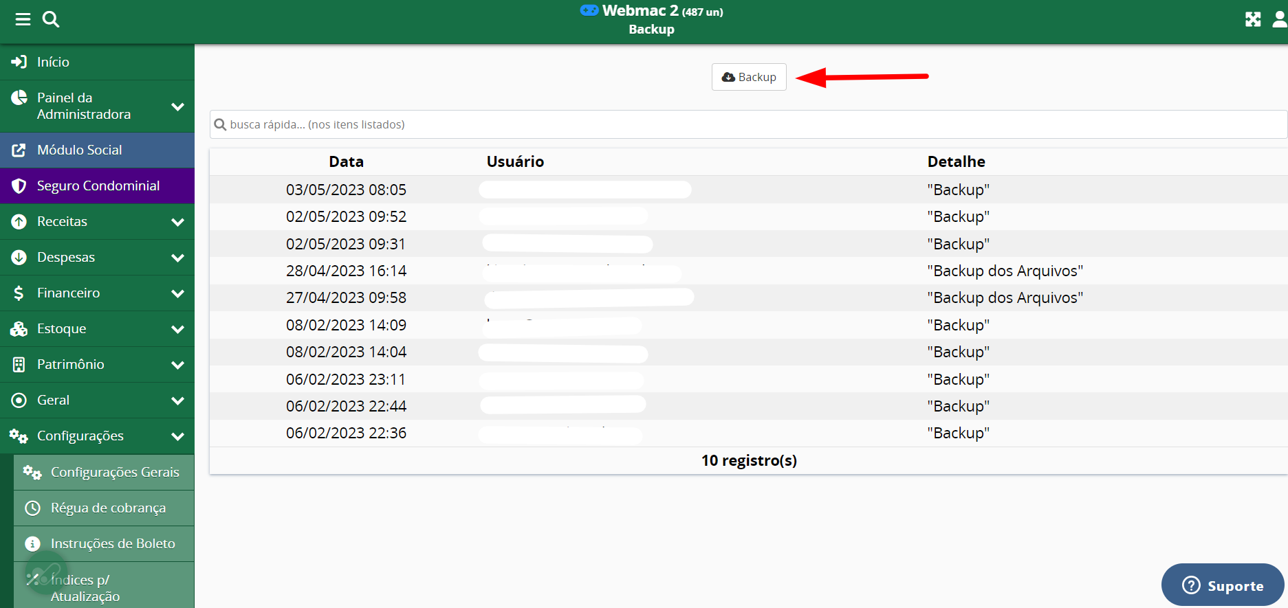 É possível baixar arquivos de backup de dados de um condomínio dos módulos Social e Financeiro Condomob.
