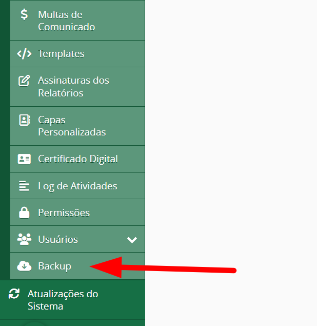 Para baixar um arquivo de backup do módulo social, basta acessar a função Meu condomínio > Backup.