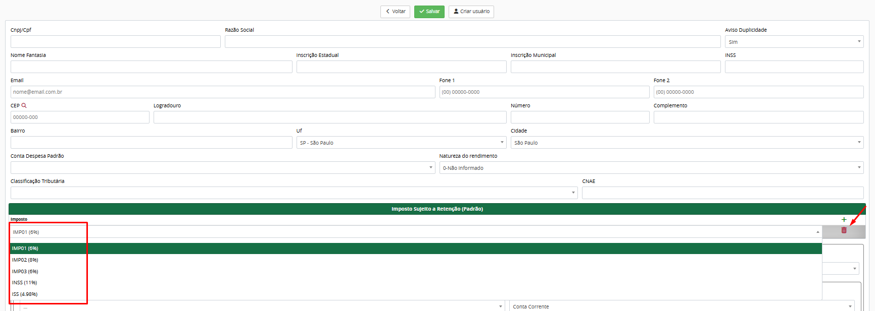 4. Cadastrar imposto sujeito a retenção: Após salvar o fornecedor, vincule um Imposto Padrão para retenção, que deve ter sido criado previamente em Despesas > Impostos Sujeitos à Retenção; ao lançar despesas, o sistema aplicará automaticamente o imposto configurado; Caso deseje excluir, basta clicar no ícone de exclusão do imposto.