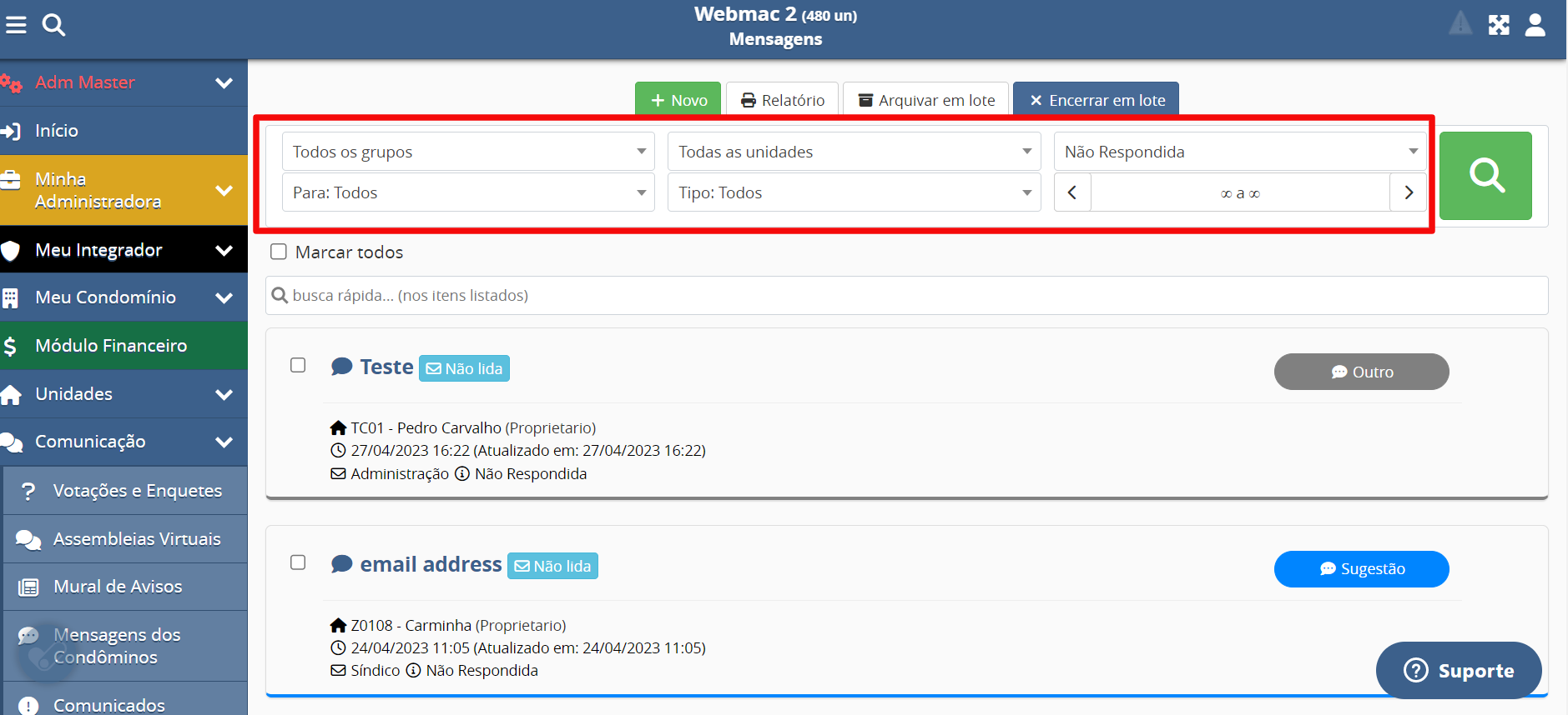 - Não Respondida: Você poderá filtrar neste campo por status das mensagens: Não Respondida, Respondida, Arquivada ou Encerrada;