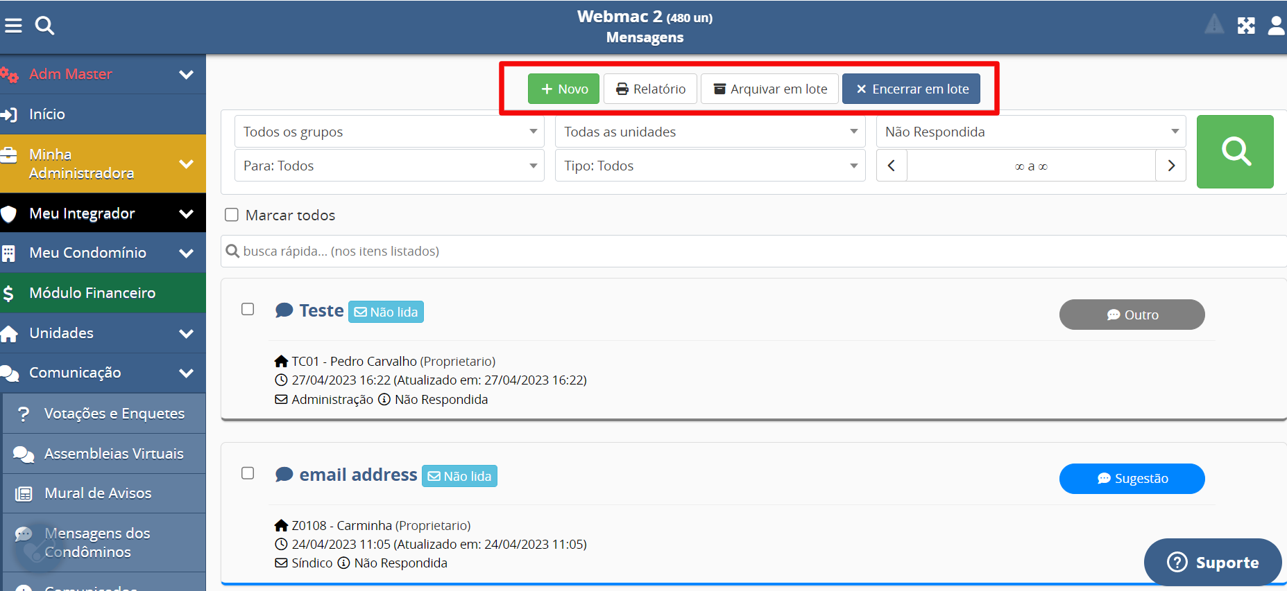 Nesta mesma tela de visualização das mensagens, você poderá criar uma nova mensagem em + Novo, imprimir um Relatório, Arquivar em Lote e Encerrar em Lote: