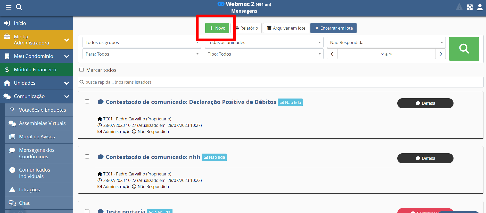 Porém a administradora poderá também iniciar uma comunicação com um condômino através desta função. Para isso clique no botão "+ Novo":