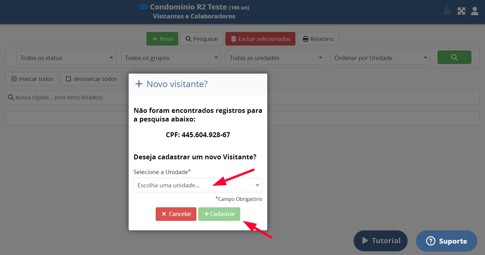 - Unidade: Unidade que será vinculado o cadastro do visitante;