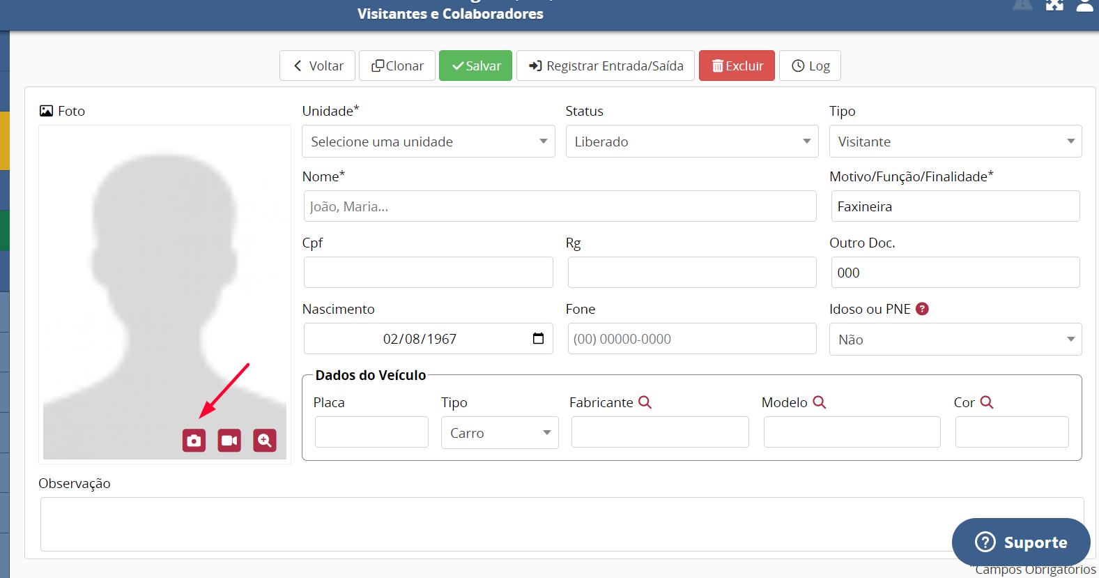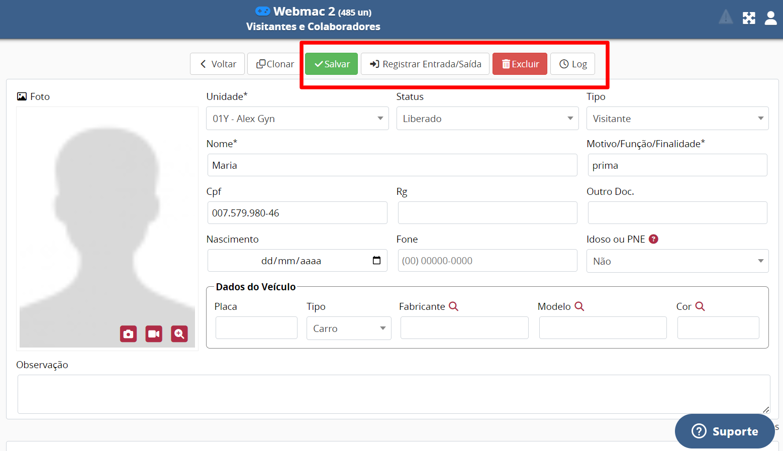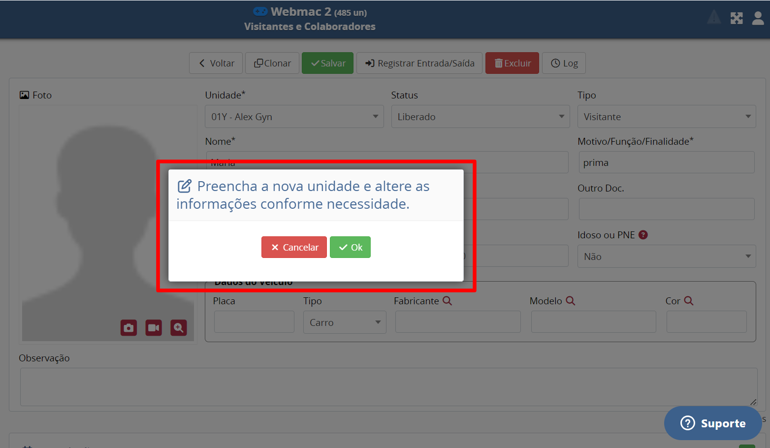 Clonar: Para casos onde o visitante irá visitar outras unidades, poderá clonar o mesmo cadastro e alterar apenas o campo da Unidade;
