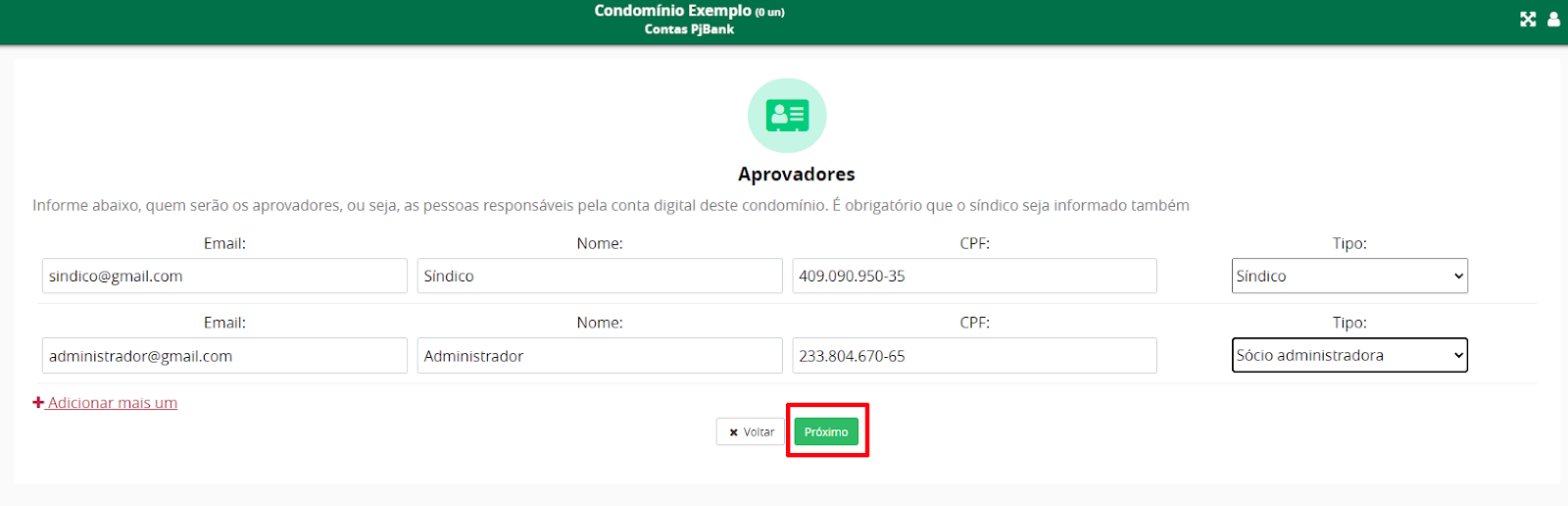 6.4 Tipo: 'Síndico', 'Pessoa Eleita em Ata', 'Pessoa Não Eleita em Ata', 'Sócio Administradora', 'Funcionário da Administradora'; - É obrigatório ter no mínimo dois aprovadores, sendo que um deles deve ser o síndico: