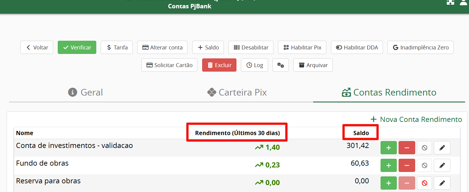 - Acesse o menu Módulo Financeiro > Geral > Contas PJBank > Contas PJBank > Conta Rendimento.
