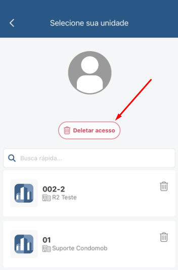 Importante: Este procedimento exclui o acesso total ao aplicativo. Se você tiver mais de uma unidade e quiser deletar apenas o acesso a uma unidade específica, clique no ícone de lixeira localizado em frente à unidade desejada;