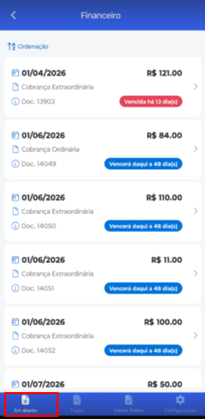 - Você verá a lista de cobranças em aberto com a data de vencimento e o valor.