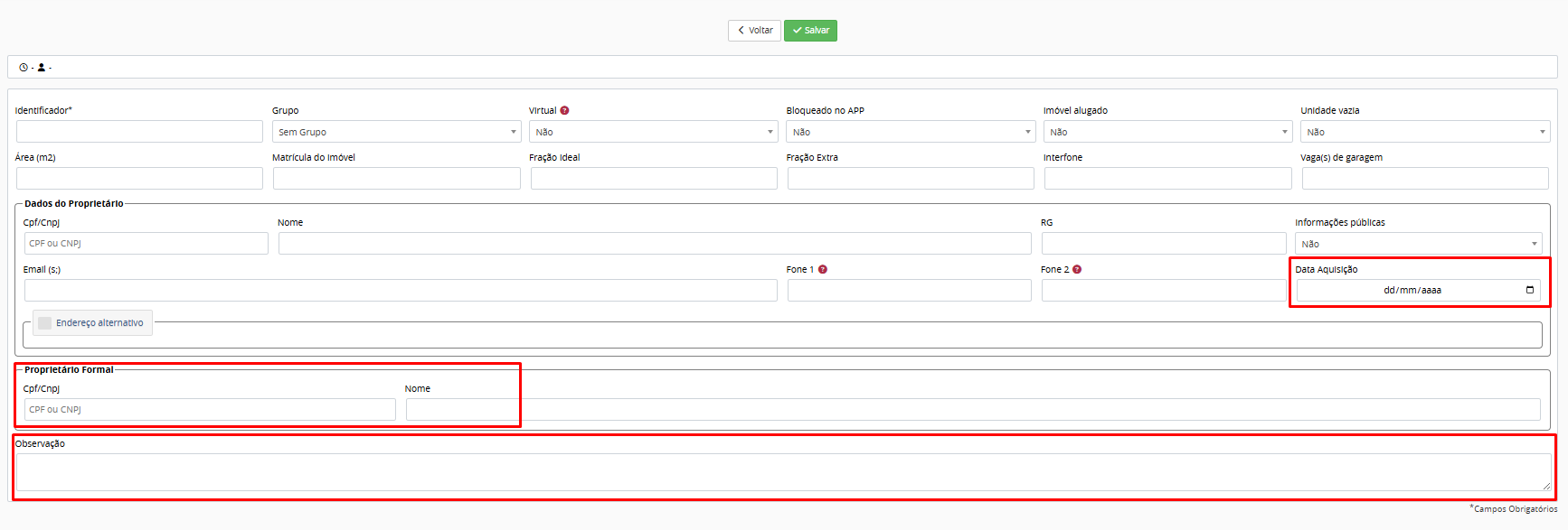 - Data de aquisição: registre a data em que o novo proprietário assumiu a unidade; ajuda a manter o histórico da unidade atualizado;