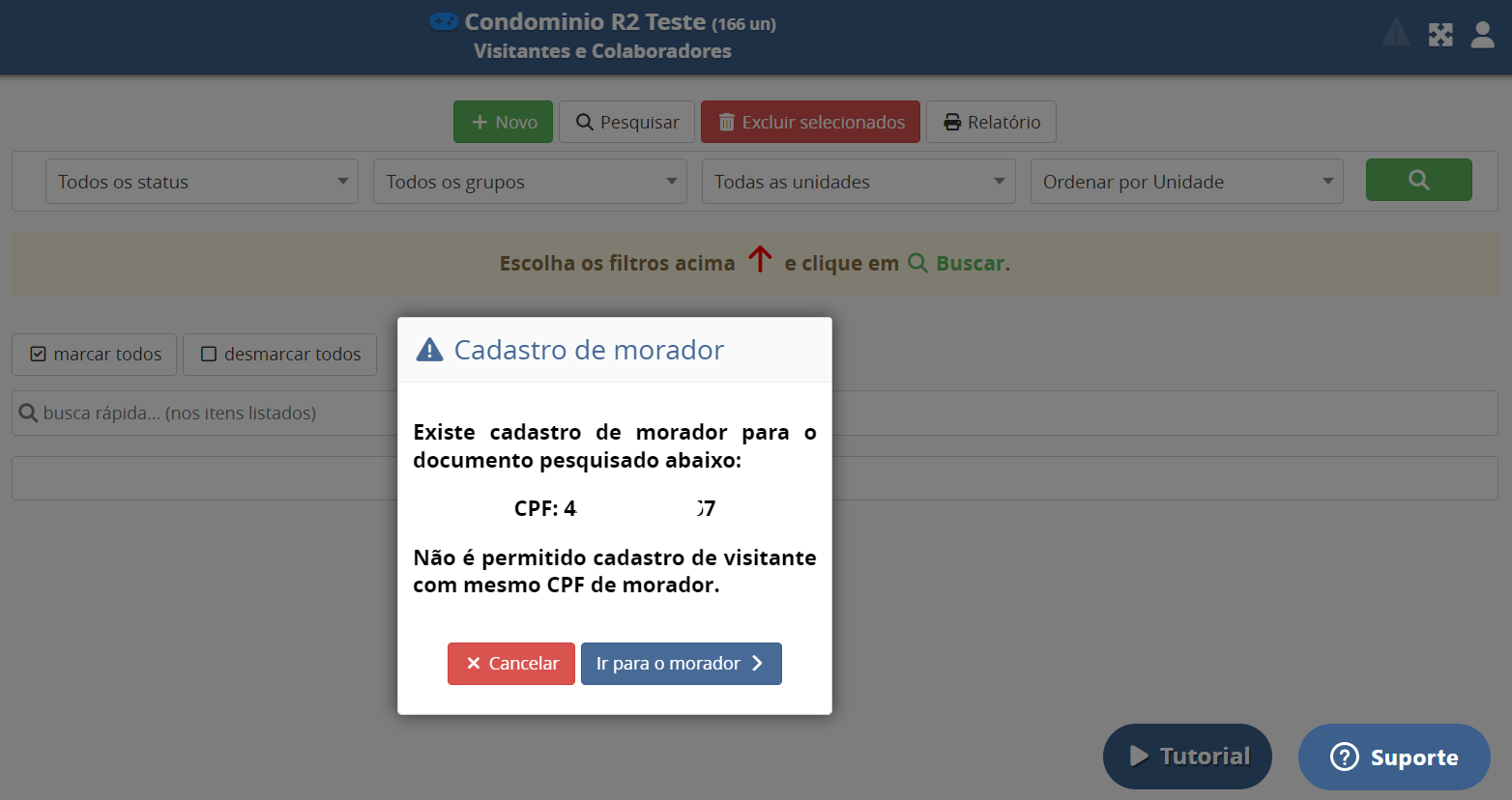 Caso preencha um CPF na pesquisa que já esteja cadastrado como Morador, será exibido a mensagem abaixo, podendo ser direcionado para o cadastro do morador clicando na opção "Ir para o morador":