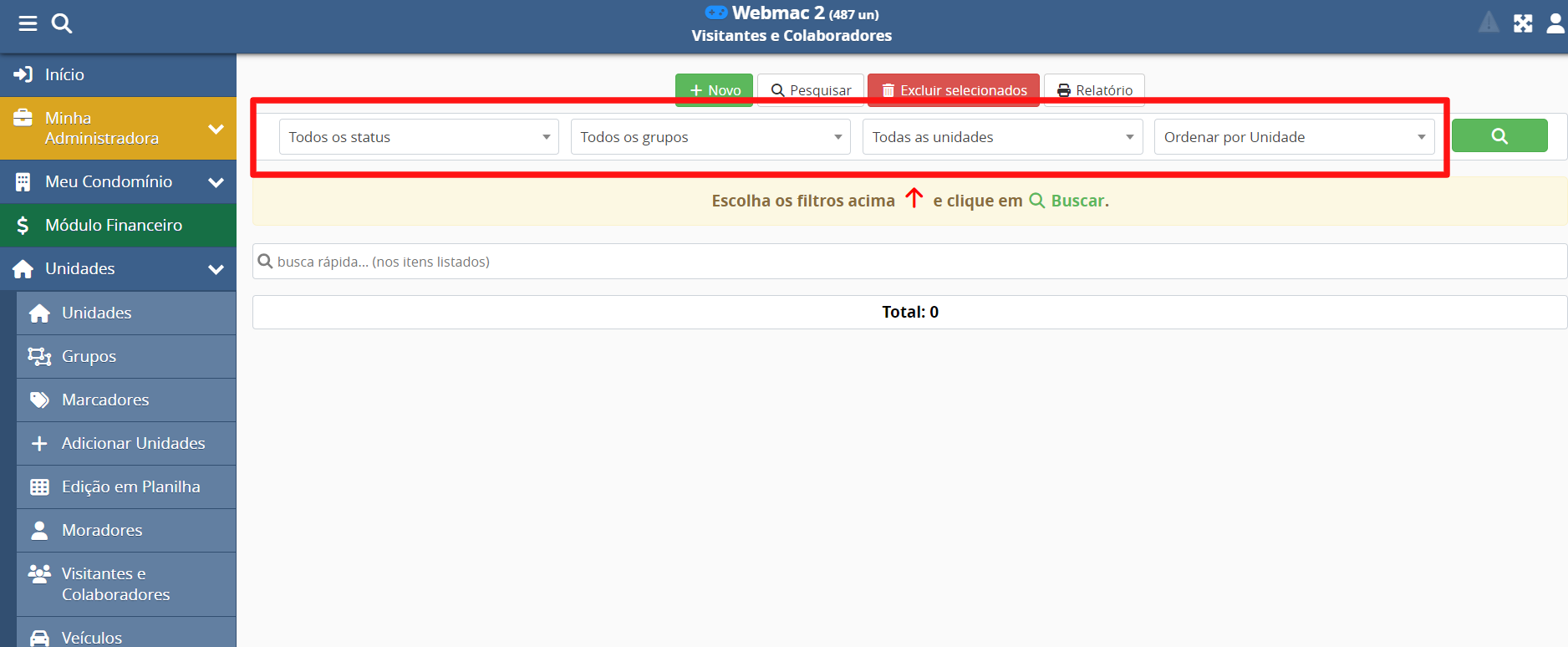 Se desejar realizar uma busca, poderá filtrar por Todos os Status, Todos os Grupos, Todas as unidades, e Ordenar por Unidade ou Nome.