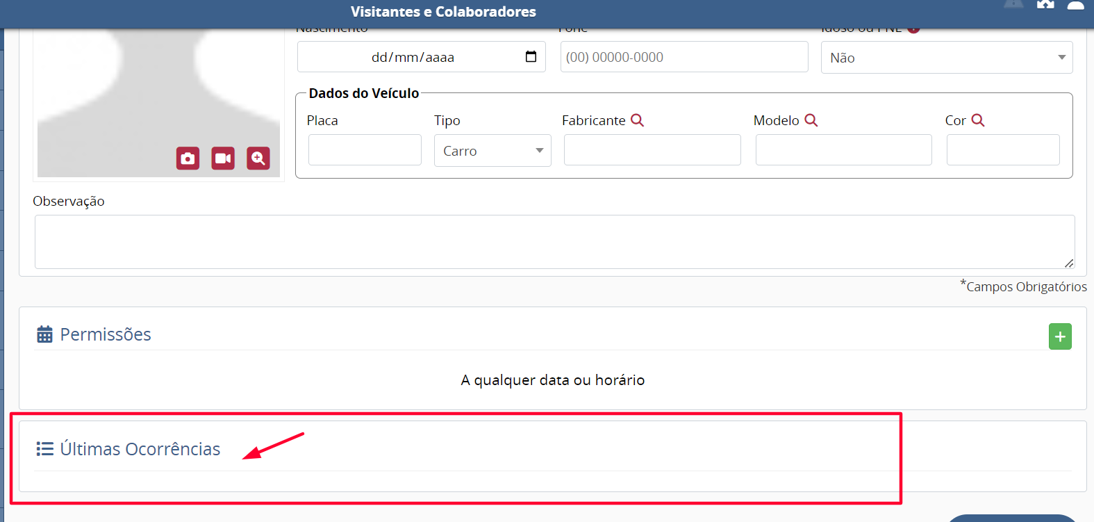 - Desça a barra de rolagem para acessar a opção Últimas Ocorrências e visualizar as últimas atividades do visitante.